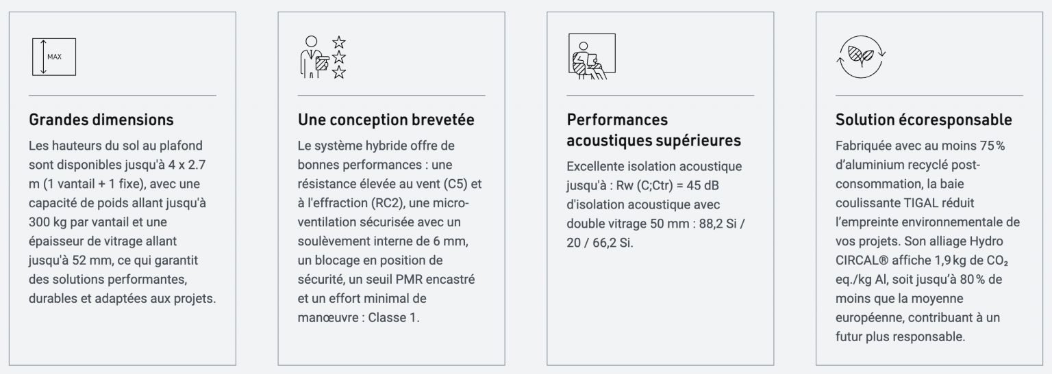 Pensé pour affronter les aléas climatiques les plus exigeants, TIGAL conjugue hautes performances thermiques et isolation acoustique avancée. Grâce à un affaiblissement sonore pouvant atteindre jusqu’à 45 dB, il crée un véritable cocon de tranquillité, même au cœur de la ville. Une prouesse qui fait de cette baie coulissante un allié précieux pour les environnements sensibles au bruit