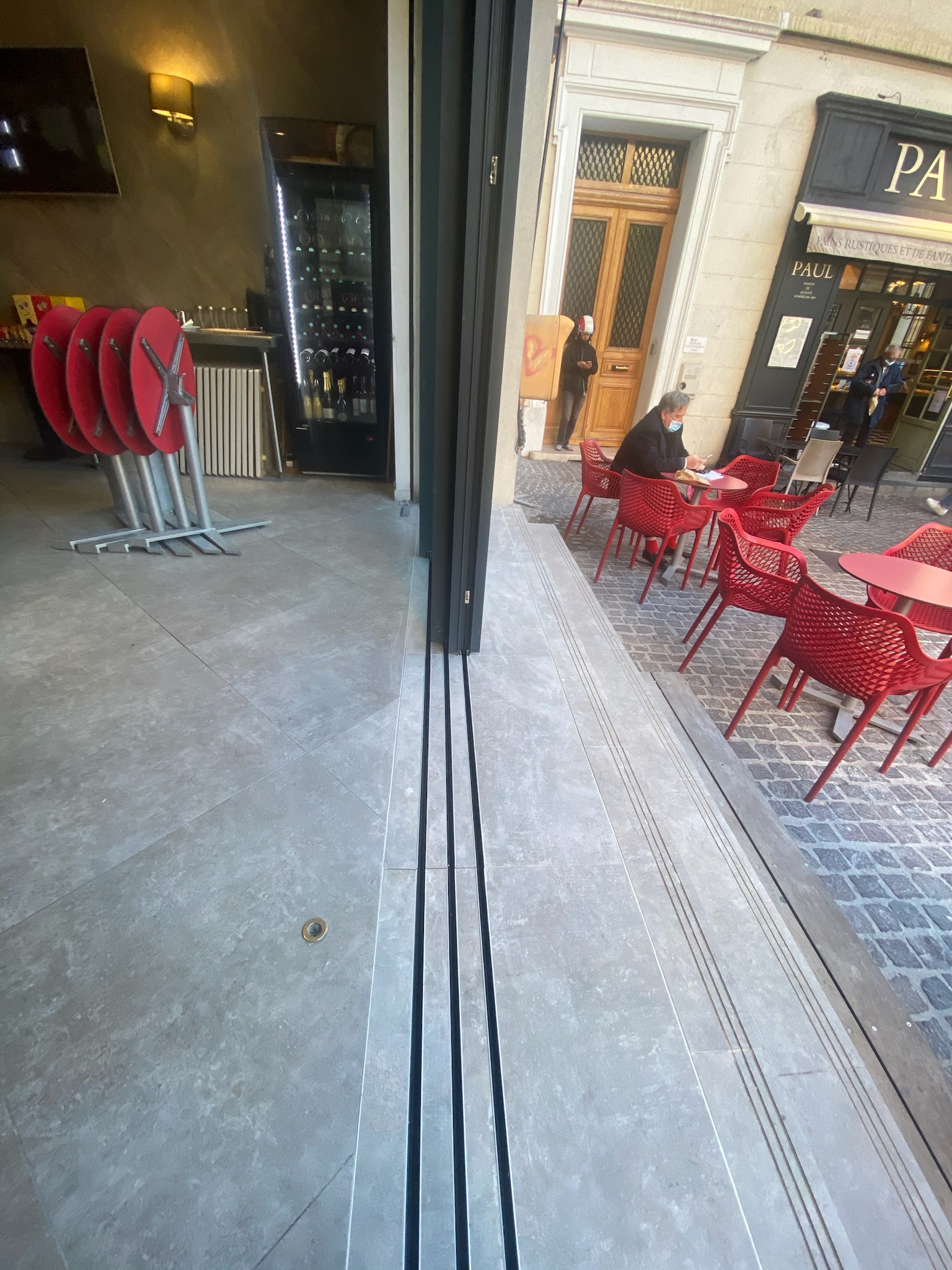 Le rail encastré garantit une intégration discrète dans le sol et une continuité esthétique avec le revêtement existant. Le coulissant offre une large ouverture, valorisant la vitrine et améliorant la visibilité du commerce tout en apportant davantage de luminosité à l’intérieur.
